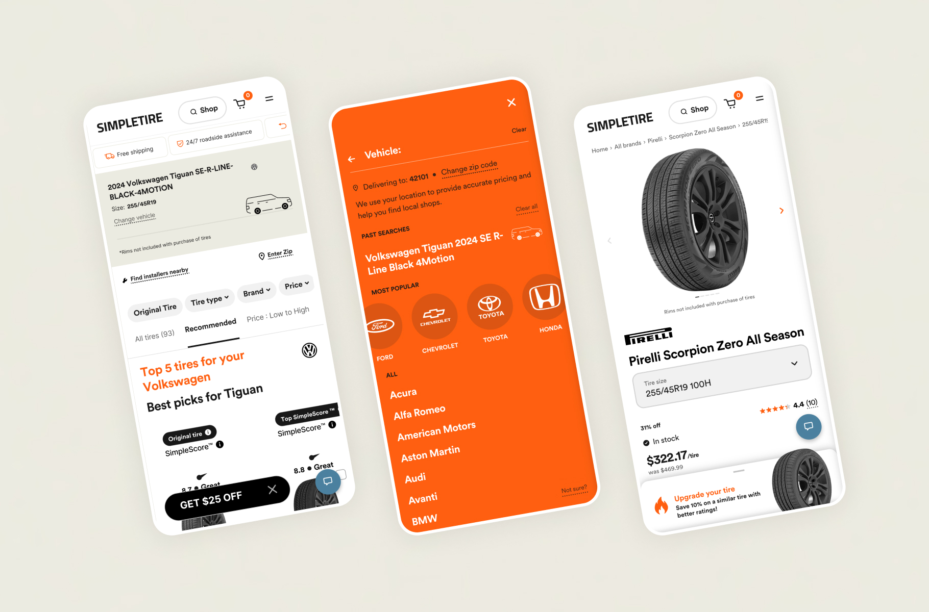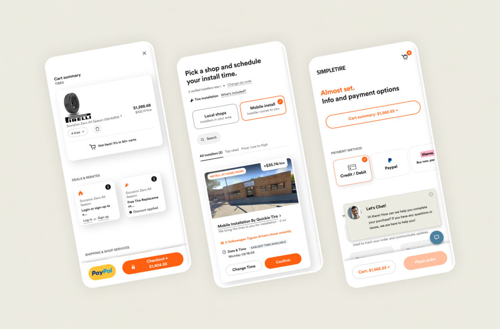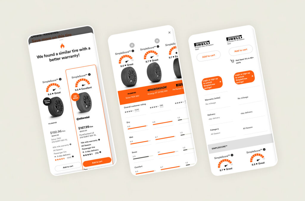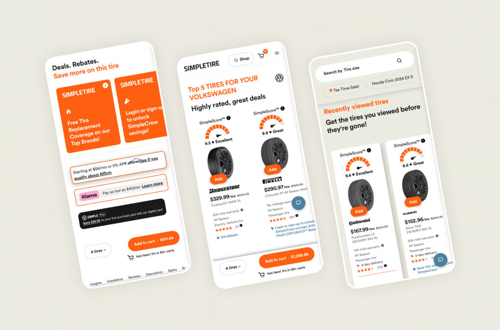 The client faced hurdles like a clunky tire selection process, outdated design, and a decline in conversion rate. These issues affected user engagement and sales. The task was to design new features, deliver multiple prototypes for testing, enhance user experience, and boost conversions while maintaining the brand’s identity.