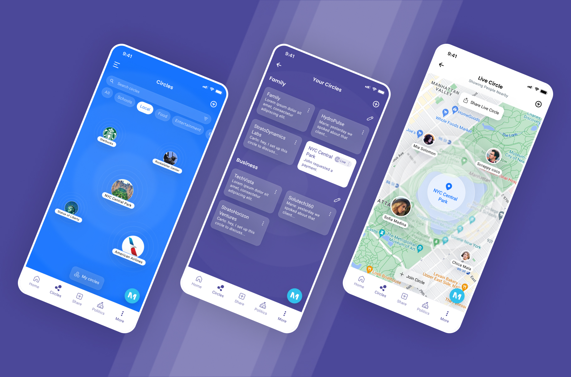 In the My Circles screen, users can not only manage their circles but also explore connections geographically. By integrating a map view, users can visualize the locations of other circle members, facilitating easier communication and collaboration. This feature enhances the sense of community by enabling users to connect with others in their vicinity. Through intuitive map navigation and seamless communication tools, users can engage with fellow circle members in real-time, fostering meaningful interactions and enhancing the overall social experience within MAI Social.