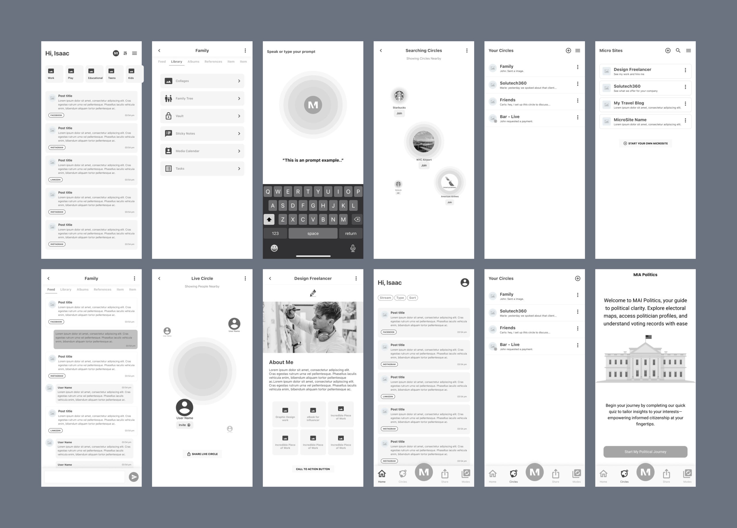 In crafting wireframes for MAI Social, I ensured each feature was thoughtfully designed. From the customizable feed to MAI Politics and Circles, wireframes prioritized user preferences and streamlined functionality. The feed wireframes focused on intuitive navigation and personalized content delivery, while MAI Politics wireframes emphasized politically relevant content. Circles wireframes facilitated seamless connections among users with shared interests. Throughout, user-centric design principles guided the process, resulting in a comprehensive suite of wireframes that laid the foundation for an engaging social networking experience.